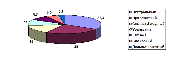 Анализ разделения проектов общественных объединений по географическому признаку подтвердил предположение о тенденции неравномерного распределения социально инициативных детей и молодежи по регионам России, связанной прежде всего с социально-экономическим развитием территорий: 33,3% проектов инициированы жителями Центрального федерального округа, 25% – Приволжского, 14% – Северо-Западного, 11% – Уральского, 8,3% – Южного, 5,5% – Сибирского, 2,7% – Дальневосточного федеральных округов (Рисунок 1). Рис.1 Распределение проектов по регионам Российской Федерации (в %)
