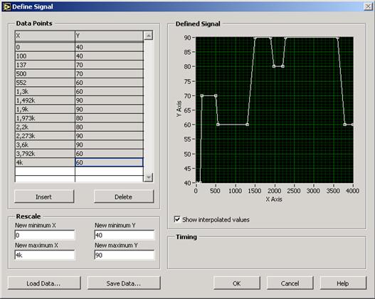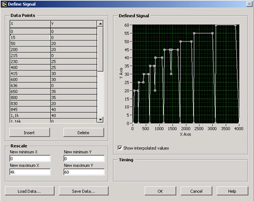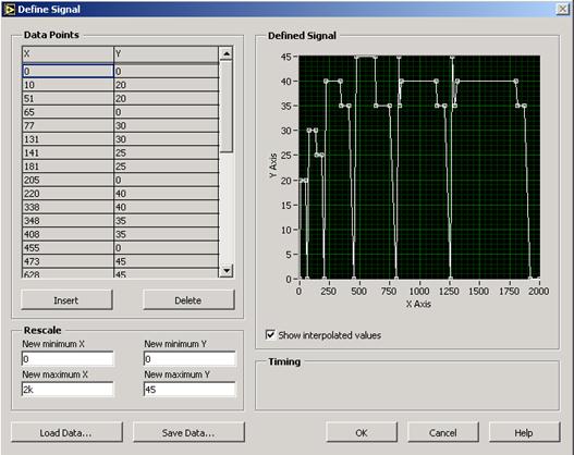 Рис. 3.14. Результат имитационного моделирования циклограммы Трижды выполнить моделирование циклограммы. Определить погрешность измерения расхода и динамическую погрешность выполнения циклограммы испытаний. Для этого необходимо записать данные эксперимента в файл с расширением.txt, например, experiment1.txt, и открыть этот файл в программе Excel, указав формат данных «с разделителями» (рис. 3.15).