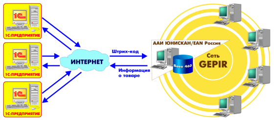 Автоматический доступ к информации о товарах, зарегистрированных в ААИ "ЮНИСКАН/EAN РОССИЯ" Предоставление пользователям системы программ "1С:Предприятие" данных о товарах из международной информационной системы GEPIR (глобальный регистр EAN International) осуществляется в рамках совместного проекта Ассоциации автоматической идентификации ЮНИСКАН / EAN Россия и Фирмы "1С". Информационная система базируется на стандартах EAN.UCC и содержит уникальные глобальные идентификационные номера предприятий (GLN) и информацию об этих предприятиях, а также глобальные номера товаров (GTIN) и данные об этих товарах. Частью информационной системы GEPIR является база данных ААИ "ЮНИСКАН/EAN Россия".