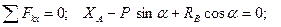1. На балку діє система довільно розташованих в площині зовнішніх навантажень: зосереджена сила - 2. Балка має дві в’язі: шарнирно-нерухому опору в точці А і стержень в точці В. Згідно принципу звільнення від в'язів замінимо їх реакціями. Шарнірно-нерухому опору замінимо реакцією, розкладеною на дві складові: 3. Рівномірно розподілене навантаження інтенсивністю q замінимо рівнодіючою силою 4. Візьмемо точку А за початок координат і проведемо осі x і у (див. мал. 4). 5. Складемо три рівняння рівноваги для плоскої довільної системи сил 1) 2) 3) 6. З рівняння (3) визначимо реакцію стержня