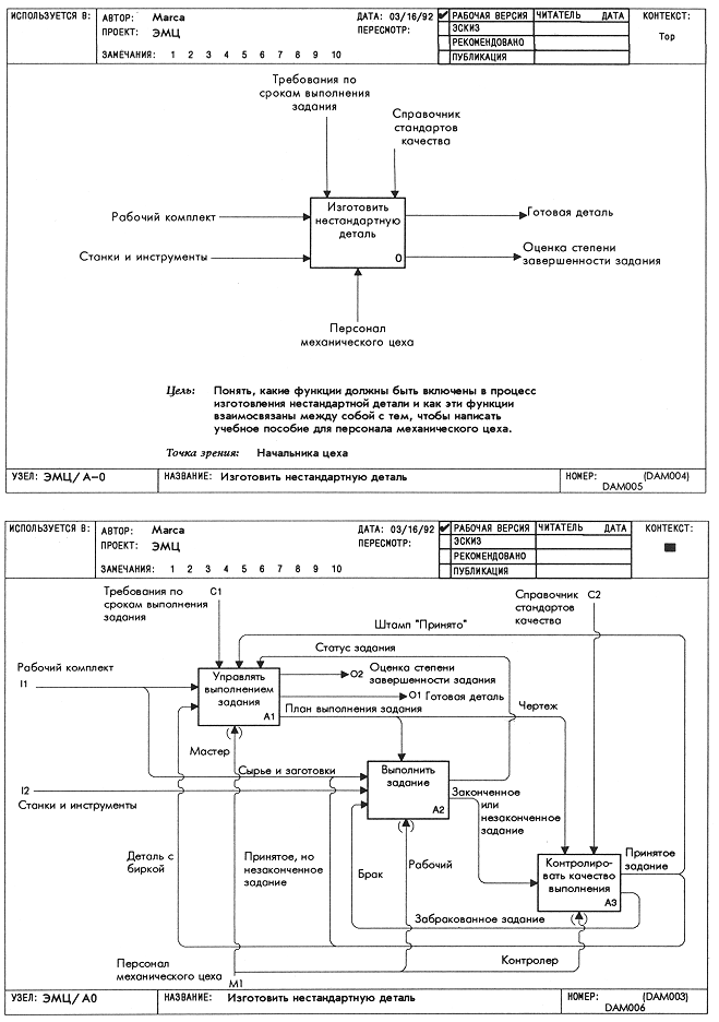 После того как определены субъект, цель и точка зрения модели, начинается первая интеграция процесса моделирования по методологии SADT. Субъект определяет, что включить в модель, а что исключить из нее. Точка зрения диктует автору модели выбор нужной информации о субъекте и форму ее подачи. Цель становится критерием окончания моделирования. Конечным результатом этого процесса является набор тщательно взаимоувязанных описаний, начиная с описания самого верхнего уровня всей системы и кончая подробным описанием деталей или операций системы. Каждое из таких тщательно взаимосогласованных описаний называется диаграммой. SADT-модель объединяет и организует диаграммы в иерархические структуры, в которых диаграммы наверху модели менее детализированы, чем диаграммы нижних уровней. Другими словами, модель SADT можно представить в виде древовидной структуры диаграмм, где верхняя диаграмма является наиболее общей, а самые нижние наиболее детализированы. На рис. 2.24. (а, б) представлены две диаграммы из модели экспериментального механического цеха.