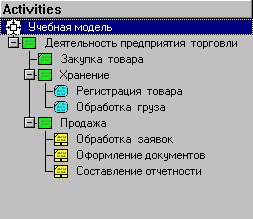 Рис. 3.9. Пример диаграммы DFD Наличие в диаграммах DFD элементов для описания источников, приемников и хранилищ данных позволяет более эффективно и наглядно описать процесс документооборота. Однако, для описания логики взаимодействия информационных потоков более подходит IDEF3, называемая также workflow diagramming, - методология моделирования, использующая графическое описание информационных потоков, взаимоотношений между процессами обработки информации и объектов, являющихся частью этих процессов. Перекресток – специфический для IDEF3 элемент – позволяет описать последовательность выполнения работ, очередность их запуска и завершения. С помощью диаграмм Workflow можно описывать сценарии действий сотрудников организации, например, последовательность обработки заказа или события, которые необходимо обработать за конечное время. Каждый сценарий сопровождается описанием процесса и может быть использован для документирования каждой функции, моделируемой в методологии IDEF0. Если в одной модели необходимо осветить специфические стороны бизнес-процессов предприятия, BPwin позволяет переключиться на любой ветви модели с IDEF0 на нотацию IDEF3 или DFD и создать смешанную модель. BPwin имеет мощный инструмент навигации - Model Explorer, который позволяет представить смешанную модель в виде дерева диаграмм и существенно облегчает навигацию по модели (рис. 3.10.). В версии BPwin 2.5 с помощью Model Explorer можно методом Drag&Drop переносить и копировать работы вместе со всеми соответствующими стрелками как внутри модели так и между моделями. Работы IDEF0 показываются в Model Explorer зеленым цветом, DFD – желтым и IDEF3 – синим.