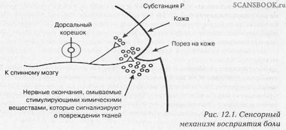 ПУТИ, ПРОВОДЯЩИЕ БОЛЕВЫЕ ИМПУЛЬСЫ Ноцицептивный (болевой) импульс, возникающий в рецепторах кожных зон проводится по аксонам первого нейрона (периферического), находящегося в клетках межпозвонковых узлов. Аксоны первого нейрона в области задних корешков попадают в спинной мозг и заканчиваются в клетках заднего рога. Второй нейрон (центральный) находится в области заднего рога Его аксоны совершают перекрест в передней спайке и переходят на периферию бокового столба в составе спино-таламического столба, достигают зрительного бугра, где и заканчиваются. Третий нейрон (центральный) начинается в таламусе и заканчивается в ядерной зоне коры больших полушарий головного мозга в области задней центральной и теменной извилин- Часть клеток второго нейрона заканчивается в ретикулярной формации ствола мозга. Оттуда идут волокна третьего нейрона до зрительного бугра. Таким образом, передача афферентных импульсов в коре головного мозга происходит по двум проводящий системам: 1. Специфическая (спино-таламический и таламокортикальный тракты) – проводящая импульсы в определенные корковые зоны. 2. Неспецифическая (ретикуло-кортикальный тракт) направляющаяся ко всем корковым полям (диффузная ретикулярная инпульсация в коре головного мозга). С функуионнальной точки зрения, ретикулярная форманация является восходящей активирующей системой. Она "облегчает усвоение" периферического раздражителя, поступившего по специфическим путям, за счет создания подпорогового раздражения и облегчает организацию целостного ответа на раздражение. При раздражении специфической болевой системы возникает простое ощущение боли, а при раздражении неспецифической болевой системы возникает сложное ощущение - страдание, страх, боли. Это происходит потому, что на болевой импулъс мобилизируется таламус и гипоталамус, и возникают вегетативные реакции, характерные для боли за счет активации адрено-кортикальной системы Болевые рецепторы - это свободные нервные окончания, расположенные внутри кожи, суставов или (чаще всего) мышц, которые приводятся в действие при изменении температуры, физическом или химическом повреждении (Рис.1,2) Данному моменту следует уделять особое внимание у детей. Лабильность нейроэндокринной системы предрасполагает к вегетативным реакциям на боль и страх ожидания боли. Поэтому, для защиты детского организма от операционного стресса, показания для проведения общего обезболивания у детей значительно шире в сравнении со взрослыми. Прервать болевое ощущение можно воздействуя на: а) периферические рецепторы; б) центральные анализирующие отделы болевой чувствительности, т.е. на кору и подкорку.
