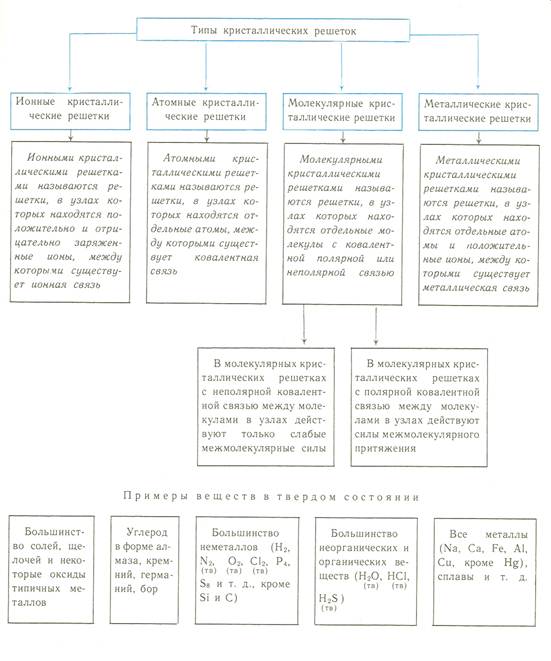 При достаточно низкой температуре практически все вещества находятся в твердом состоянии. В этом состоянии расстояние между частицами вещества сопоставимы с размерами самих частиц, что обеспечивает их сильное взаимодействие и значительное превышение у них потенциальной энергии над кинетической энергией.. Движение частиц твердого вещества ограничено только незначительными колебаниями и вращениями относительно занимаемого положения, а поступательное движение у них отсутствует. Это приводит к внутренней упорядоченности в расположении частиц. Поэтому для твердых тел характерна собственная форма, механическая прочность, постоянный объем (они практически несжимаемы). В зависимости от степени упорядоченности частиц твердые вещества разделяются на кристаллические и аморфные. Кристаллические вещества характеризуются наличием порядка в расположении всех частиц. Твердая фаза кристаллических веществ состоит из частиц, которые образуют однородную структуру, характеризующуюся строгой повторяемостью одной и той же элементарной ячейки во всех направлениях. Элементарная ячейка кристалла характеризует трехмерную периодичность в расположении частиц, т.е. его кристаллическую решетку. Кристаллические решетки классифицируются в зависимости от типа частиц, составляющих кристалл, и от природы сил притяжения между ними.