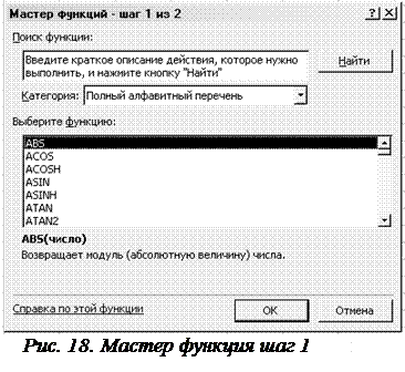 В верхней части палитры размещаются поля, предназначенные для ввода аргументов, а в нижней части располагается справочная информация. Здесь указывается общее описание назначения функции, а также сведения о задаваемом аргументе. Если аргумент указан полужирным шрифтом, значит, он является обязательным, а если обычным шрифтом, то его можно опустить. Задавать аргументы функции можно в числовом виде (вручную с клавиатуры) или как ссылки на ячейки (вручную с клавиатуры или щелчком на соответствующей ячейке). Некоторые функции могут принимать в качестве параметра диапазон ячеек. При заполнении ячеек формулами, включающими функции, абсолютные и относительные адреса ячеек используются так же, как и в случае простых формул. В нижней части окне расположена ссылка Справка по этой функции, которая вызывает необходимую справочную информацию. Здесь же расположено Значение:, которое является результатом выполнения вычислений по выбранной функции.