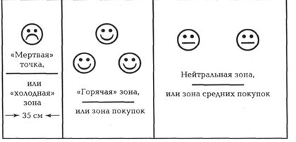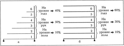 Рис. 5.9.Наиболее вероятная схема размещения товаров на коротких (а) и длинных (б) пристенных прилавках Неравномерность распределения познавательных ресурсов покупателя, а следовательно, и объемов продаж отдельных марок товаров наблюдается и по вертикали прилавка. Такая ситуация обусловлена не только поведенческими и психофизиологическими особенностями, но и антропологическими характеристиками человека, а также эргономическими свойствами оборудования. При анализе показателей по вертикали прилавка (стеллажа) тоже обнаруживаются различия в объемах продаж товаров, размещенных на нижних или верхних полках, т.е. можно выделить «холодные», «горячие» и нейтральные зоны (рис. 5.10).