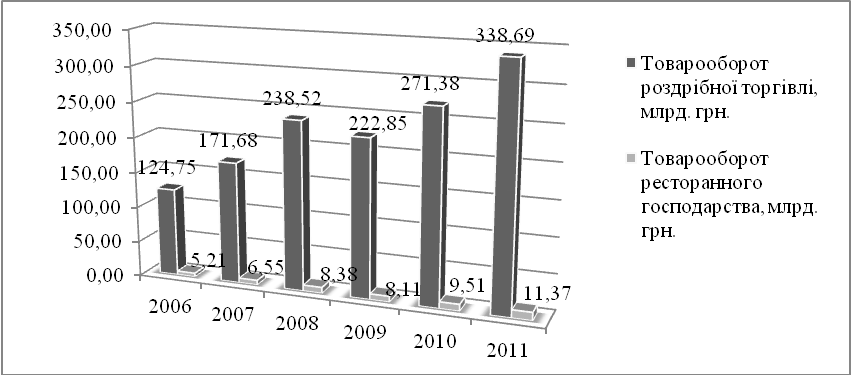 Рис. 1 – Динаміка зміни обсягів роздрібного товарообороту підприємств 2006-2011рр. Відповідно до цього спостерігається і зміни товарообороту роздрібної торгівлі та товарообороту підприємств ресторанного господарства. Так, у 2011 порівняно з 2010р. можна відмітити збільшення товарообороту роздрібної торгівлі на 67,31 млрд. грн., або на 24,8% і товарообороту ресторанного господарства на 1,86 млрд. грн. або на 19,56% (рис.2).