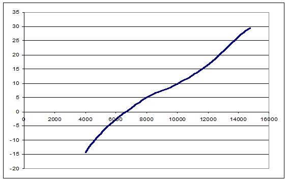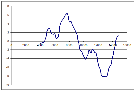 После определения радиуса корреляции необходимо подобрать размер скользящего окна для осреднения. Подбор производится экспериментальным путем. Исходный сигнал усредняется сначала окном равным двум радиусам корреляции R, а затем размер окна увеличивается, до тех пор, пока полностью не сгладится аномальный эффект, как показано на рисунке 10. После сглаживания аномального эффекта, полученный график и представляет собой региональный фон. После выделения регионального фона необходимо воспользоваться формулой 11 и определить аномальный эффект. График аномальных значений представлен на рисунке 11. Как видно, полученный аномальный эффект несколько отличается от того, что был получен ранее (рис. 6), тем не менее, оба эффекта имеют достаточно выраженные сходные черты, а значит характер аномалии сохраняется. Сравнением аномальных эффектов, полученных в работах 2 и 4 можно руководствоваться для проверки правильности вычислений.