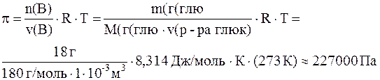 7. Вычислите осмотическое давление, а также понижение температуры замерзания раствора, в литре которого содержится 18 г глюкозы C6H12O6 при 00C. Криоскопическая константа воды составляет 1,850С·кг/моль. Решение. Согласно закону Вант-Гоффа осмотическое давление равно: