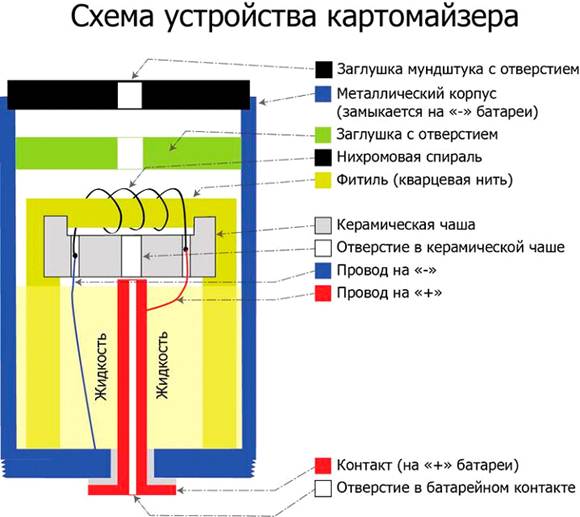 Как видно из схемы в картомайзере нет метапены, зато есть ёмкость для жидкости, в которую опущен фитиль. В остальном принцип работы картомайзера аналогичен принципу работы атомайзера. Вот еще одна схема картомайзера