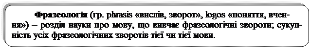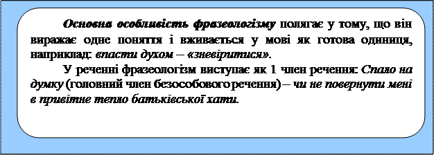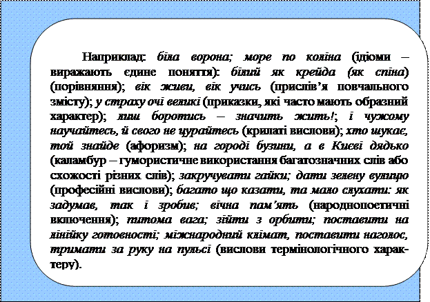 Стійке сполучення слів, грамагично організованих за моделлю словосполу-чення або речення, називається фразеологічною одиницею або фразеологізмом За сферою вживання (із стилістичного погляду) виділяються книжні фра-зеологізми, які використовуються переважно в писемній формі наукового, офі-ційно-ділового, публіцистичного і художнього стилів: болючі проблеми, заходи адміністративного впливу, зійти з орбіти, коефіцієнт корисної дії, питома вага та ін. Крім того, виділяються розмовно-побутові, які переважають в усному мов-ленні і художній літературі: вродися та вдайся, казці кінець – ділу вінець, як тіло без душі; іти світ за очі; аби день до вечора; скільки вовка не годуй, той все у ліс дивиться. Ще розрізняють народно-поетичні фразеологізми: хай наші вороги пла-чуть; не так склатось, як гадалось; будь здорова, як вода, а багата, як земля. Фразеологізми характеризуються семантичною злитістю компонентів, ці-лісністю значення і автоматичним відтворенням у мовленні. Наприклад: біла во-рона; море по коліна (ідіоми – виражають єдине поняття): білий як крейда (як спіна) (порівняння); вік живи, вік учись (прислів’я повчального змісту); у страху очі великі (приказки, які часто мають образний характер); лиш боротись – зна-чить жить!; і чужому научайтесь, й свого не цурайтесь (крилаті вислови); хто шукає, той знайде (афоризм); на городі бузини, а в Києві дядько (каламбур – гумо-ристичне використання багатозначних слів або схожості різних слів); закручувати гайки; дати зелену вулицю (професійні вислови); багато що казати, та мало слу-хати: як задумав, так і зробив; вічна пам’ять (народнопоетичні включення); пи-тома вага; зійти з орбити; поставити на лінійку готовності; міжнародний клі-мат, поставити наголос, тримати за руку на пульсі (вислови термінологічного характеру). Основна особливість фразеологізму полягає у тому, що незалежно від кіль-кості слів у його складі, він виражає одне поняття і вживається у мові як готова одиниця, наприклад: впасти духом – «зневіритися». У реченні фразеологізм виступає як 1 член речення: Спало на думку (голов-ний член безособового речення) – чи не повернути мені в привітне тепло бать-ківської хати.