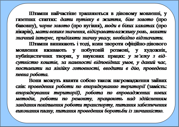 Кліше (стереотип) — готовий мовний зворот, що вживається як стандарт у певних умовах та контекстах або — звичний зворот, регулярно повторюваний у певних умовах і контекстах для тотожного позначення адекватних ситуацій, сто-сунків між людьми тощо. Хоча термін кліше цілком адаптований у сучасній тер-міносистемі практичної стилістики, його часто ототожнюють, плутають, вжи-вають на його заміну термін мовний штамп. Мовні штампи — це стерті, колись образні вислови, зайві слова, неточні вислови, безконечні, стилістично не вмотивовані словесні повтори, які створюють негативний і стилістико-смисловий ефект. На відміну від мовного штампа — часто вживаного виразу із бляклим лексичним значенням, стертою лексичною експресивністю, — кліше становить конструктивну одиницю, що зберегла семантичну виразність. Позитивні властивості кліше — відповідність психологічним стереотипам; легка відтворюваність готових мовних формул, тобто цілковита готовність до ви-користання; економія зусиль для комунікаторів, а отже, і полегшення комунікації. Хоч мовні кліше рідко породжують штамп, але наявність таких конструкцій не на своєму місці або багаторазове їх повторення призводить до появи штампів: «Це людина, яка брала участь в боях проти німецько-фашистських загарбників. Він брав участь у визволенні Орла, Вітебська, Мінська, Вільнюса, Києва...». Втра-та нормативності особливо помічається там, де повинна переважати індивідуаль-на манера письма. У такому разі без потреби вжиті канцелярські вислови типу за рахунок; у зв’язку з; згідно з; у результаті; у силу; з метою та інші, іменники від-дієслівного походження типу забезпечення виконання завдання негативно впли-вають на сприймання. Головною причиною породження штампів є відсутність в авторській мові тих засобів, які допомогли б швидко, зручно й економне висловити думку. Тому й спостерігається нанизування кількох абстрактних слів, розташованих поряд: питання підвищення; забезпечення виконання; здійснення завдання, виконання зо-бов’язання. У таких випадках найкраще один з іменників (перший) замінити ін-фінітивом: забезпечити виконання; виконати зобов’язання. Слово питання слід випускати. Іноді в основу таких словосполучень уводяться слова робота, бороть-ба, експеримент, дослідження та інші, за якими йде не властивий загальнонарод-ній мові прийменник по. Повторюючись у багатьох словосполученнях, він також штампує мову: робота по впровадженню…, боротьба по винищенню..., експери-мент по застосуванню..., дослідження по ліквідації..., які треба замінювати сло-восполукою з прийменником з або зовсім змінювати (впроваджувати, винищува-ти, експеримент із застосування, дослідження з ліквідації). Одні й ті самі слова-означення, що додаються часто до іменників у мовних кліше, також бувають штампами: мати велике значення; відігравати важливу роль; приділяти значну увагу; склалися певні стосунки; викликають значний інтерес; у даний час та ін. Особливо невиразні означення певний і даний, які по-трібно замінювати конкретними прикметниками та займенниками — невеликий, незначний, цей. Не сприяють чіткому висловленню думки слова або цілі вислови, що су-перечать логічному зв’язку: більша половина (треба більша частина); у березні місяці; живопліт з кущів; озима пшениця, посіяна восени тощо. Штампами вва-жаються й л