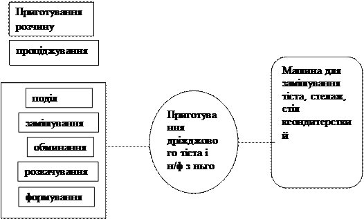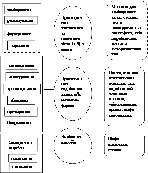2. Визначаемо режим роботи цеху і робітників протягом тижня та доби. Передбачаємо, що цех працює 12 годин в одну зміну з 6 до 18 години. Робітники цеху працюють за двобригадним методом по11,5 годин з 2-ма перевами по 15 хвилин. 3. Визначаємо відповідно до потужності і асортименту продукції виробничу структуру цеху - відділення, ділянки та інші підрозділи. Кондитерський цех потужністю 7000 виробів відноситься до цехів середньої потужності. Потужність цеху визначає склад і площі його приміщень. Відповідно до сніпу цех середньої потужності має такі приміщення: 1 приміщення підготовки яєць, 2.відділення замісу тіста, розробляння і випікання 3.приміщення оздоблення виробів 4. мийна інвентарю 5. кладова сировини 6 приміщення експедиції 4. Складаємо технологічні схеми приготування окремих видів тіста i відповідних виробів.
