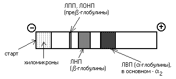 Липопротеины можно разделить и методом электрофореза. При классическом щелочном электрофорезе разные липопротеины ведут себя по-разному. При помещении липопротеинов в электрическое поле хиломикроны остаются на старте. ЛОНП и ЛПП можно обнаружить во фракции преb-глобулинов, ЛНП - во фракции b-глобулинов, а ЛВП - a-глобулинов:
