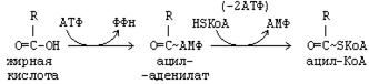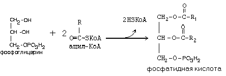 Здесь наблюдается глубокий распад АТФ до АМФ. АМФ не может вступить в окислительное фосфорилирование. Поэтому существует реакция: АТФ + АМФ Þ 2АДФ. Поэтому затраты на активацию молекулы жирной кислоты эквивалентны затрате двух АТФ. Следующим этапом на пути синтеза жира является реакция образования фосфатидной кислоты:
