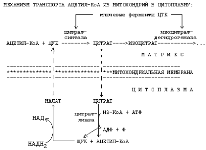 Реакции синтеза не зависят от того, каково происхождение веществ – участников реакций. Жир может синтезироваться как из продуктов распада жира, так и из углеводов. Синтез эндогенного жира из углеводов протекает в печени и в жировой ткани. Ацил-КоА синтезируется из Ацетил-КоА. ГБФ-путь распада углеводов обеспечивает синтез энергией. Образование Ацетил-КоА происходит в матриксе митохондрий. Синтез жирных кислот идет в цитоплазме на мембранах эндоплазматического ретикулума путем постепенного удлинения ацетил-КоА на 2 углеродных атома за каждый цикл. Удлинение высших жирных кислот, содержащих более 16 углеродных атомов, идёт путём реакций, обратных b-окислению (О b-окислении смотрите ниже, раздел «Катаболизм жирных кислот»). Однако реакции синтеза жирных кислот до 16 углеродных атомов принципиально отличаются от реакций, обратных b-окислению. Они протекают обходным обратным путём. Отличия реакций синтеза высших жирных кислот от обратных бета-окислению: 1. b-окисление протекает в митохондриях, а синтез жирных кислот протекает в цитоплазме на мембранах эндоплазматического ретикулума. Но образуется Ацетил-КоА в митохондриях, а через мембраны сам проходить не может. Поэтому существуют механизмы транспорта Ацетил-КоА из митохондрий в цитоплазму.
