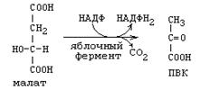 Ключевыми ферментами ЦТК являются цитратсинтаза и изоцитратдегидрогеназа. Основные аллостерические регуляторы этих ферментов - это АТФ и АДФ. Если в клетке много АТФ, то АТФ выступает как ингибитор этих ключевых ферментов. Однако изоцитратдегидрогеназа угнетается АТФ сильнее, чем цитратсинтетаза. Это приводит к накоплению цитрата и изоцитрата в матриксе митохондрии. При накоплении цитрат выходит из митохондрии в цитоплазму. В цитоплазме есть фермент цитратлиаза. Этот фермент расщепляет цитрат на ЩУК и Ацетил-КоА. Условием для выхода Ацетил-КоА из митохондрии в цитоплазму является хорошее обеспечение клетки АТФ. Если АТФ в клетке мало, то Ацетил-КоА расщепляется до СО2 и Н2О. 2. В ходе b-окисления промежуточные продукты связаны с HS-КоА, а при синтезе жирных кислот промежуточные продукты связаны с особым ацил-переносящим белком (АПБ). Это сложный белок. Его небелковая часть похожа по строению на КоА. Небелковая часть АПБ состоит из тиоэтиламина, пантотеновой кислоты (витамин В3) и фосфата. 3. При b-окислении в качестве окислителя используются НАД и ФАД. При синтезе ЖК нужен восстановитель - используется НАДФ*Н2. В клетке существует 2 основных источника НАДФ*Н2 для синтеза жирных кислот: а) ГМФ-путь распада углеводов б) В реакции окисления малата (смотрите рисунок).