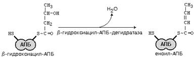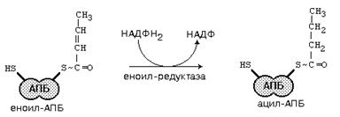 После этого ацил-АПБ вступает в новый цикл синтеза. К свободной SH-группе ацилпереносящего белка присоединяется новая молекула малонил-КоА. Затем происходит отщепление ацильного остатка, и он переносится на малонильный остаток с одновременным декарбоксилированием, и цикл реакций повторяется. Таким образом, углеводородная цепочка будущей жирной кислоты постепенно растет (за каждый цикл – на два углеродных атома). Это происходит до момента, пока она не удлинится до 16 углеродных атомов (в случае синтеза пальмитиновой кислоты) или более (синтез других жирных кислот). Вслед за этим происходит тиолиз, и образуется в готовом виде активная форма жирной кислоты – ацил-КоА.