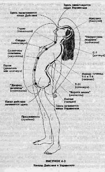 РИСУНОК 4-1 Наиболее мощный энергетический обмен между двумя партнерами имеет место на уровне тонкой энергии. Даосы в течение тысяч лет изучали циркулирование тонкой энергии через некоторые энергетические точки тела и основательно доказали их большое значение. Эти энергетические точки являются основой акупунктуры. Хотя западные медицинские исследования и признали акупунктуру клинически эффективной, ученые признаются, что они не могут полностью объяснить, как работает эта система. Циркулирование энергии через эти энергетические точки, или меридианы, называется "Микрокосмической орбитой" (рис. 4-1). Микрокосмическая орбита Все, изучающие Систему целительного Дао, учатся обращать свою энергию ци по Микрокосмической орбите - это необходимый этап для понимания принципов совершенствования цзин от грубого физического уровня яйцеклеток до очищенной тонкой энергии шэнъ, или до духовного бытия. Если они открыли свою Микрокосмическую орбиту, то они уже испытали небольшое Просветление. Их ум уже стал осознавать, что он может управлять их тонкой энергией. В конечном счете они узнают, что движение тонкой энергии всецело зависит от силы мысли. Б. ОБНАРУЖЕНИЕ МИКРОКОСМИЧЕСКОЙ ОРБИТЫ Несколько тысяч лет назад все в мире было весьма простым: не было ни телевидения, ни радио, ни театров, ни ночных клубов в качестве развлечения, не было домов, о которых нужно было бы заботиться, - не было ничего такого, что способствует утечкам энергии и беспокойству ума. Воздух был чистым. Люди имели в изобилии естественную энергию. Когда садилось солнце, люди не могли сразу же лечь спать, но они и не могли бродить по джунглям в темноте. Одним из способов занять свое время было сесть и успокоиться. Если они были в состоянии до некоторой степени успокоить свои мысли, их тела также начинали успокаиваться. Они начинали замечать в своем теле какое-то течение. Течение начиналось в пупке, шло вниз до промежности, затем вверх вдоль позвоночника к голове, а затем спускалось вниз через переднюю часть тела к языку, к горлу и снова к пупку. Циркуляция энергии по этому маршруту стала известной как Микрокосмическая орбита. Чем в большей степени они могли успокоить свой ум и тело, тем более интенсивным должен был быть поток. По мере того, как они продолжали успокаивать свой ум, они начинали обнаруживать все больше открывающихся в них путей и чувствовать потоки энергии, направляющиеся вниз и вверх. Ощущалось, что поток, идущий от промежности к голове, проходит через основные органы тела по трем каналам, которые позднее стали известны как Пронизывающие каналы. При продолжении практики они начинали чувствовать, что анергия течет по кругу, вроде пояса, вокруг основного энергетического центра, который они обнаружили в пупке, - это Опоясывающий канал. По прошествии времени они обнаружили, что в их теле существует 32 энергетических канала, каждый из которых соответствует определенному органу. Эти знания передавались потомкам поколение за поколением, все больше и больше людей осваивали эти знания на практике - таким образом были обнаружены акупунктурные меридианы, которые стали основой излагаемой системы. Все люди имеют одинаковое тело и одинаковые каналы, все люди имеют душу и дух. После многих сотен лет практики, проб и ошибок, взлетов и падений, была разработана система даосс