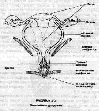 В теле имеются не одна, а несколько диафрагм. Каждый из вас знаком с диафрагмой, которая расположена в грудной полости, отделяет сердце и легкие от органов, расположенных в брюшной полости, и помогает нам дышать. Когда вы вдыхаете, эта диафрагма опускается вниз, увеличивая тем самым объем грудной полости и позволяя легким наполнить ся воздухом; чем глубже дыхание, тем ниже опускается диафрагма. Меньше известно о тазовой и мочеполовой диафрагмах, которые отделяют область таза от области промежности. Для того чтобы правильно практиковать Яичниковое дыхание, вы должны использовать не только грудную диафрагму, но и тазовую и мочеполовую диафрагмы (рис.5-1). Они играют роль ворот, открывающих или перекрывающих путь потоку энергии к органам, или роль поршня, который гонит энергию вверх к высшим центрам. Правильное дыхание обеспечивают именно эти нижние диафрагмы. Они играют чрезвычайно важную роль в даосской практике преобразования генерируемой в половых органах энергии в энергию более высокого типа. 1. ТАЗОВАЯ ДИАФРАГМА Тазовая диафрагма представляет собой мышечную стенку, которая простирается поперек нижней части туловища. Она подвешена между сращением лобковых костей в передней части тела и копчиком в задней части (рис. 5-2). Эту мышечную ткань пронизывают несколько органов, поскольку она разделяет полость таза и промежность. К этим органам относятся уретра (мочеиспускательный канал), влагалище и прямая кишка. Одной из функций тазовой диафрагмы является поддержание этих органов, вследствие чего овладение контролем за этой диафрагмой обеспечивает больший контроль и за этими органами. Тазовая диафрагма является также Дном брюшной полости, содержащей желудок, тонкую и толстую кишки, печень, мочевой пузырь и почки. Она поддерживает эти жизненно важные органы снизу и помогает сохранять их форму. 2. МОЧЕПОЛОВАЯ ДИАФРАГМА В области промежности, на полпути между анальным отверстием и влагалищем, ниже тазовой диафрагмы расположен еще один мышечный орган - мочеполовая диафрагма. Она пронизывается уретрой, а сбоку к ней прикреплено тело клитора (рис. 5-3).