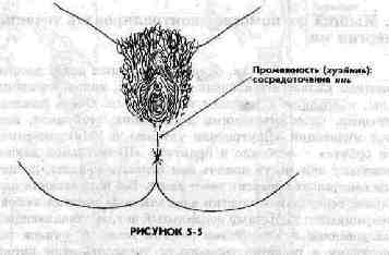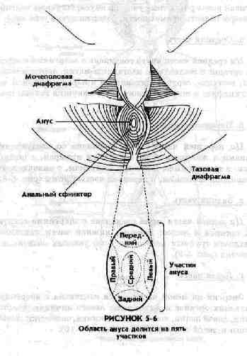Различные участки области анального отверстия тесно связаны с энергией ци органов и желез тела. Если анальное отверстие не является запечатанным или крепко стиснутым, мы легко можем терять через эту "реку без возврата" сексуальную энергию и питательные вещества, необходимые для нашей жизненной силы; они будут вытекать и изыматься из обращения. 3. ОБЛАСТЬ АНУСА РАЗДЕЛЕНА НА ПЯТЬ УЧАСТКОВ Область ануса разделена на пять участков: средний, передний, задний, левый и правый (рис. 5-6). Сжимая и втягивая вверх различные участки ануса, вы также втягиваете вверх область промежности, содержащую в себе анус. а. Средняя часть Ци средней части ануса соединена с энергиями следующих органов и желез тела: влагалища-матки, аорты и полой вены, желудка, сердца, щитовидной и паращитовидной желез, гипофиза и шишковидного тела, макушки головы (рис.5-7). б. Передняя часть Ци передней части ануса соединена со следующими органами и железами тела: с мочевым пузырем, с шейкой матки, с тонким кишечником, с желудком, с вилочковой и щитовидной железами, с передней частью мозга (рис. 5-8). в. Задняя часть Ци задней части ануса соединена с энергиями следующих органов и желез: крестца, нижней части поясницы, двенадцати грудных позвонков, семи тазовых позвонков и мозжечка (рис. 5-9). г. Левая часть Энергия ци левой части ануса соединена с энергиями следующих органов и желез тела: левого яичника, толстой кишки, левой почки, левого надпочечника, селезенки, левого легкого и левой полусферы мозга (рис. 5-10).