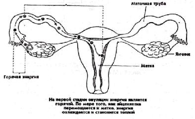 д. Правая часть. Энергия ци правой часть ануса связана с энергиями следующих органов и желез тела: правого яичника, толстой кишки, правой почки, правого надпочечника, печени, желчного пузыря, правого легкого и правой полусферы мозга (рис. 5-11). Если вы хорошо натренированы в управлении своей мышцей ци, то вы легко можете привести целительную сексуальную энергию к тем конкретным органам или железам тела, которые вы желаете исцелить, или передать энергию своему партнеру во время занятий любовью. В последней части раздела, посвященого "Оргазмическому вытягиванию вверх", вы узнаете, как привести свой оргазм к разлизным органам и железам своего тела. Е. Энергия яичников ян - целительная и созидательная сила Древние даосы были чрезвычайно прницательны в своих наблюдениях, и их открытиях в области секса удивительно согласовывались друг с другом на протяжении длительного периода времени, исчисляющего в Китае не сотнями, а тысячами лет. Это удивительно еще и потому, что многие группы не знали о достижениях и даже о существовании других групп, поскольку все эзотерические практики обычно сохранялись в большом секрете. Они заметили, что яичники имеют основное значение при производстве сексуальной энергии в форме яйцеклеток и женских гормонов, потому что все остальные жизненно важные органы, такие, как, например, мозг, должны для формирования и поддержания их отдавать часть своих резервов. Кроме того, в записях даосов указывается, что в первой части женского менструального цикла имеют место огромные накопления горячей энергии жизненной силы, которую они называют "ян-цзин-ци" (ци яичников) (рис. 5-12). Как уже отмечалось, энергия ян во время овуляции активизирует яйцеклетку и заряжает ее жизненной силой, обладающей большими потенциальными возможностями, что является признаком сильной и молодой энергии со способностями созидать и целить.
