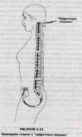 Следующей точкой останова является точка С-7, расположенная в верхней части спины у основания шеи. Вы можете почувствовать ее как позвонок, выступающий наружу, когда вы наклоняете голову вниз. Эта точка контролирует энергию, поступающую к рукам и шее, а также к лопаткам и спинному мозгу. Эта точка обладает также способностью преобразовывать сексуальную энергию в энергию жизненной силы. (1) СБОР ЭНЕРГИИ ВО "ДВОРЦЕ ЯИЧНИКОВ" Выполняйте все так же, как описано выше. Соберите энергию яичников во "дворце яичников". Сделайте короткий вдох, слегка закройте влагалище и тяните энергию вниз к промежности. Затем напрягите и втяните вверх переднюю часть промежности, сделайте паузу и задержите дыхание, удерживая энергию в этой точке. Осознайте приведенную сюда энергию цзин-ци. Сделайте короткий вдох, крепко закройте влагалище и сконцентрируйтесь на удержании энергии яичников в передней части промежности. Выдохните и возвратитесь к яичникам, но часть своего внимания оставьте на промежности для удержания приведенной туда энергии. Продолжайте выполнять Яичниковое дыхание, слегка открывая и закрывая влагалище и собирая энергию во "дворце яичников". (2) ВЫТЯГИВАНИЕ ЭНЕРГИИ Я ТОЧКЕ С-7 Если вы почувствовали, что собрано достаточное количество энергии яичников, то вдохните небольшую порцию воздуха и закройте влагалище, втягивая энергию яичников вниз к промежности, а затем втяните вверх переднюю часть промежности для приведения энергии в эту точку. Отдохните немного и осознайте энергию, которая пришла из яичников во влагалище, клитор и промежность. Сделайте короткий вдох, сожмите среднюю и заднюю части промежности, а затем тяните энергию вверх к крестцу и точкам Т-11 и С-7. Когда вы достигнете точки С-7, продвиньтесь слегка от грудины к спине и почувствуйте усилие в точке С-7 и в обоих плечах и то, как они активизируются, вытягивая энергию вверх (рис. 5-22). Эти действия активизируют тимус на увеличение силы, вытягивающей энергию вверх. Удерживайте энергию в этой точке максимально удобным для вас образом. По мере того, как вы будете больше практиковать, вы обнаружите, что постепенно вы учитесь все больше задерживать свое дыхание и лучше поглощать воздух. Выдохните, а потом пусть ваши крестец, область точки Т-11 и шея расслабятся, вернувшись к своему нормальному состоянию. Сконцентрируйте свое внимание на точке С-7. Эти действия позволят вам через некоторое время активизировать все три "помпы" (крестцовую, надпочечную и черепную). Если вы испытываете при этом какие-то неудобства, вернитесь ко "дворцу яичников" и повторите процесс. Выполняйте это девять раз. Помните, что для того, чтобы привести энергию к более высоким центрам, вы должны все время возвращаться к ее источнику. д. Пятая станция: "Нефритовая подушка", минихранилище и точка преобразования сексуальной энергии Следующей вашей точкой останова является "нефритовая подушка". Она размещается на задней части головы между точкой С-1 и основанием черепа. Эта точка может служить также как небольшое хранилище сексуальной энергии и как место ее преобразования. (1) СБОР ЭНЕРГИИ ВО "ДВОРЦЕ ЯИЧНИКОВ"