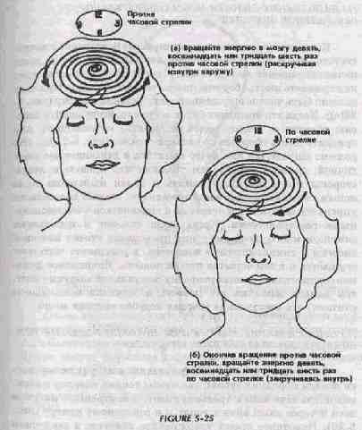 ж. Циркулирование энергии в мозгу (1) НАПОЛНЕНИЕ ПОЛОСТИ МОЗГА СОЗИДАТЕЛЬНОЙ СЕКСУАЛЬНОЙ ЭНЕРГИЕЙ Когда вы закончите это девятикратное повторение и почувствуете, что сексуальная энергия яичников наполнила мозг, начните вращение энергии в мозгу, делая девять, восемнадцать или тридцать шесть оборотов против часовой стрелки. При этом должно быть четкое ощущение раскручивания наружу (рис. 5-25(а)). Когда это вращение будет окончено, возвращайте энергию обратно к центру мозга за девять, восемнадцать или тридцать шесть оборотов по часовой стрелке (рис. 5-25(6)). Это должно ощущаться как нечто приятное и делающее вас энергичной, должно помочь вам уравновесить правую и левую стороны мозга, улучшая память и делая мышление более ясным, а также введет вас в начальную стадию способности управлять сексуальной энергией и справляться с эмоциональными расстройствами. Когда люди стареют и используют слишком много своей ци, у них происходит утечка мозговой энергии и спинномозговой жидкости, в результате чего мозг осушается и в нем остается пустая полость. Яичниковое дыхание осуществляет транспортировку сексуальной энергии в мозг, тем самым заполняя эту полость и оживляя мозг. Даосы считают, что сексуальная энергия подобна энергии мозга. (2) ПРИКОСНОВЕНИЕ ЯЗЫКА К НЁБУ ПОЗВОЛЯЕТ ЭНЕРГИИ ТЕЧЬ ВНИЗ ДЛЯ НАКОПЛЕНИЯ В ОБЛАСТИ ПУПКА