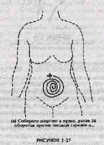 Обеспечьте, чтобы язык прикасался к нёбу (к поверхности позади передних зубов), так чтобы теплая энергия яичников могла течь вниз к третьему глазу, к внутренним пазухам носа и через язык вниз к горлу и к сердечному центру (рис.5-26). Некоторое время удерживайте энергию в сердечном центре, наполняя его до тех пор, пока оно ощущается открытым; наслаждайтесь ощущением любви, радости и покоя; затем ведите энергию дальше к солнечному сплетению и пупку. Собирайте сексуальную энергию в пупке, где она может безопасно храниться. з. Собирание сексуальной энергии яичников в пупке Очень важно закончить этот процесс накоплением энергии в пупке. Многие вредные эффекты этой практики вызваны избыточным накоплением энергии в голове или в сердце. Пупок может безопасно справиться со все возрастающими количествами энергии, вырабатываемой яичниками. (1) ЗАКРУЧИВАНИЕ ЭНЕРГИИ СПИРАЛЬЮ ВОКРУГ ПУПОЧНОГО ЦЕНТРА Чтобы собрать энергию яичников, сконцентрируйте внимание на области пупка, расположенной в теле на глубине около полутора дюймов. Используйте ум, глаза и другие органы чувств, чтобы мысленно вводить энергию в эту область и выводить ее из нее, закручивая энергию спиралью вокруг пупка и делая при этом 36 оборотов. Не организовывайте спирали вокруг грудной диафрагмы или вокруг лобковой кости. Начинайте раскручивать спираль против часовой стрелки (рис. 5-27(а)). Затем измените направление закручивания спирали и приведите энергию обратно в пупок, делая почасовой стрелке 24 оборота (рис. 5-27(6)). Первые несколько раз используйте в качестве направляющей свой собственный палец. Теперь энергия надежно и безопасно хранится в вашем пупке, доступная для использования каждый раз, когда ваше тело нуждается в ней.