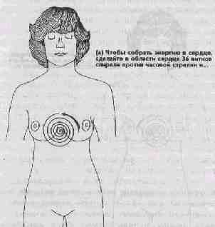 и. Собирание энергии в сердце Энергию можно накапливать и в сердце. Если ваше тело имеет тип ян (что означает, что ваше тело является более горячим, чем у большинства людей, и что может проявляться в горячем темпераменте), то вы не должны начинать с накопления энергии в сердечном центре. Начинайте с накопления энергии в пупочном центре. Когда пупок будет полон, это будет указанием на то, что каналы достаточно открыты, чтобы без каких-либо проблем начать накопление энергии в сердце. Сердечный центр является для женщины энергетической станцией. Это место, где размещается любовь, радость, счастье, и это место ее омоложения, поскольку здесь расположен тимус. Если этот центр открыт, то, кроме ощущения в себе энергии, женщина будет испытывать все эти положительные эмоции, а также будет обладать избыточным запасом целительной энергии для лечения как самой себя, так и других. Если сердечный центр открывается до того, как она готова. Микрокосмическая орбита не будет завершенной и энергия не будет правильно циркулировать. Сексуальная энергия может застревать в сердце, и тепло, переполняющее это место, может стать источником больших проблем, таких как беспокойство, удушье или боли в области груди. Если это случилось с вами, практикуйте "целительные звуки" сердца, как это описано в книге "Даосские методы преобразования стресса в жизненность", организуя отток энергии от груди и сердца путем поглаживания рукой груди сверху вниз до тех пор, пока вы не "срыгнете", высвобождая попавшую в ловушку энергию. (1) ЗАКРУЧИВАНИЕ ЭНЕРГИИ СПИРАЛЬЮ ВОКРУГ СЕРДЕЧНОГО ЦЕНТРА