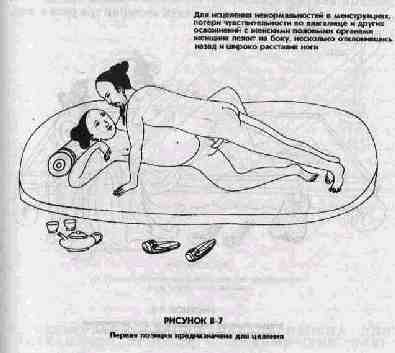 Первая целительная позиция предназначена для питания энергией женщины, которая испытывает различные проблемы с менструациями, такие как судороги или чрезмерное кровотечение, потеря ощущений во влагалище или любые другие женские проблемы. Женщина лежит на боку или на спине с широко расставленными ногами, и ее задачей является просто оставаться в этом положении и получать целительную энергию от мужчины, который приспосабливает свое положение к ее положению и проникает в нее. Практикуйте в этой позиции до двух серий по девять введений полового члена каждый день в течение пятнадцати дней. Б. ВТОРАЯ ПОЗИЦИЯ ПРЕДНАЗНАЧЕНА ДЛЯ НАПОЛНЕНИЯ ТЕЛА ЭНЕРГИЕЙ И ДЛЯ ЛЕЧЕНИЯ ПОЛОВЫХ ОРГАНОВ (РИС. 8-8)