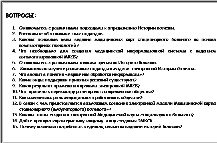 Применение компьютерных технологий позволяет создавать электронную модель такого объекта, как «Медицинская карта стационарного (амбулаторного) больного» в интересах различных пользователей и в разных целях. В идеале, такая модель должна устраивать всех заинтересованных лиц, и обеспечить повышения качества всех процессов управления здоровьем пациентов. Однако, очевидно, что решить весь комплекс вопросов одновременно невозможно. Должна быть выработана некоторая стратегия этапности разработки. Представляется, что первым этапом должна явиться функция сбора и первичной обработки информации о больном в интересах лечащего врача, врача–консультанта и среднего персонала. Применение компьютерных систем, построенных на базе локальных сетей с специализированными системами управления базами данных (СУБД), позволяет резко улучшить целый ряд показателей качества базы данных, таких как достоверность, актуальность, внутренняя непротиворечивость, полнота, удобство использования, быстрота поиска и доступа к информации. Но уровень разработки должен быть таким, чтобы получить реальное облегчение работы, иначе внедрение системы, не дающей выгоды работникам, встречает их неприятие и прямое противодействие. Этот этап требует значительных капитальных вложений в создание быстрой локальной сети, монтаж достаточного числа рабочих мест, установку мощного сервера, приобретение, запуск и организацию обслуживания сложного и дорогостоящего системного и прикладного программного обеспечения, включая серверные ОС, СУБД и т.д. Следующим этапом становится автоматизация сбора сводной аналитической информации в интересах: 1) администрации учреждения, 2) органов здравоохранения и 3) фондов медицинского страхования. Одновременно желательна разработка модели работы учреждения, которая позволит проводить прогнозирование его работы с оценкой качества планируемых управленческих решений. Сложной проблемой остается определение критериев оптимальности для таких решений. Что будет главным – экономическая стабильность учреждения, максимальное количество пролеченных больных, качество лечения? Точное количественное соотношение значений этих критериев, а порой и сам способ количественной оценки, не выработаны. Вероятно, что оценка будет отличаться, в зависимости от точки зрения (финансирующий орган, руководитель лечебного учреждения, государство в целом или больной как отдельный гражданин). Третий этап – создание базы знаний и разработка экспертных систем, позволяющих, с одной стороны, помочь врачу в выработке оптимальной стратегии в ведении больного, с другой – проанализировать полноту проведения необходимых мероприятий при конкретном диагнозе. В настоящее время Министерством здравоохранения РФ выработаны требования к созданию «Стандартных протоколов ведения больных» (приказ №303 от 3 августа 1999 г), работа по формированию таких протоколов идет по всей стране. Это внушает надежду, что в обозримом будущем на рынке появятся программные комплексы, позволяющие использовать эти знания в реальных клинических случаях. В течение всего этого периода, на каждом её этапе, желательно обеспечить медицинский персонал возможностью оперативного получения информации не только из истории болезни или подразделений больницы, но и пользоваться инфор