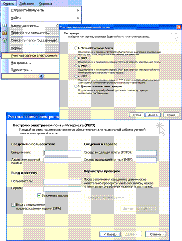 Нажав кнопку «Зарегистрировать почтовый ящик», Вы получаете свой почтовый ящик с уникальным адресом (E-mail), например: abc@mail.ru 2. Открыть программу Outlook и создать учетную запись. Для того чтобы создать учетную запись дайте команду меню «Сервис» Учетные записи (Рис.6). Произойдет запуск Мастера подключения к Интернету. В первом диалоговом окне Мастера выбираем команду «добавить новую учетную запись электронной почты». Во втором диалоговом окне Мастера выбираем тип сервера, с которым будет работать новая учетная запись (POP3).