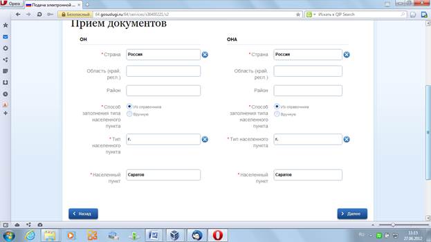 Заполняем подпункт «Сведения о женихе и невесте» согласно приведенной форме. Звездочкой (*) отмечены графы, обязательные для заполнения. Нажимаем кнопку «Далее».