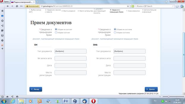 Заполняем подпункт «Сведения о предыдущем браке». Нажимаем кнопку «Далее».