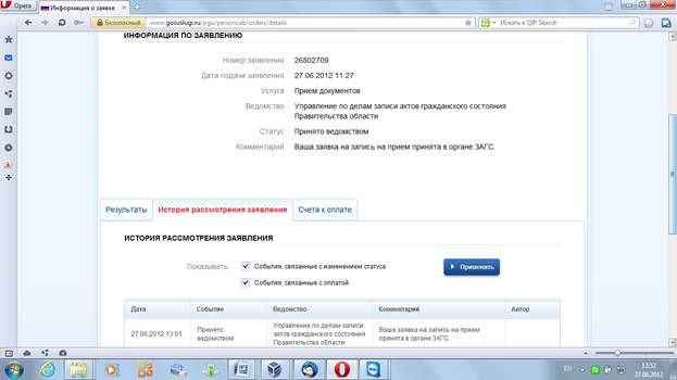 В истории рассмотрения заявки появится комментарий: «Ваша заявка на запись на прием принята в органе ЗАГС».