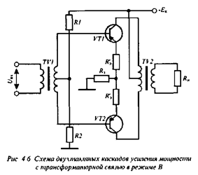 Достоинства: малые нелинейные искажения, так как в сердечнике отсутствует постоянная составляющая магнитного потока и не происходит насыщение; схема не чувствительна к пульсациям напряжения питания. Недостатки: все недостатки трансформаторных схем - узкий диапазон частот, повышенные габариты и вес трансформатора, большие частотные искажения. Однотактный трансформаторный каскад (эквивалентная схема и АЧХ). Трансформаторный каскад представляет собой однотактный усилитель с трансформаторным симметричным выходом. Симметрия выхода достигается выводом средней точки вторичной обмотки трансформатора