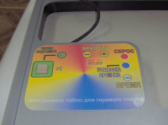 Рисунок 1. 2.2. Габаритные размеры табло, мм, не менее - (610 х 410 х 50), 2.3. Масса табло, кг, не более: – 8. 2.4. Высота информационных знаков -100 мм., цвет индикаторов времени – зеленый, цвет индикаторов счета – красный. 2.5. Количество информационных знаков с каждой стороны – по 8, 2.6. Расстояние различимости информационных знаков не менее 30м. 2.7. Длина шнура питания табло - 1,5 м. 2.8. Питающее напряжение табло – 220 В., 50 Гц. 2.9. Потребляемая мощность табло не более 50 Вт. 2.10. Табло могут работать, как в групповом, так и индивидуальном режиме. 2.11. Устанавливаемые промежутки времени в мин.: 1, 2, 3, 5, 10,12,15,18, 30, 60, 108. 2.12. Ход времени – назад. Короткая сирена в начале временного промежутка и в конце. 2.12. В групповом режиме табло управляются с радиопульта с расстояния до 30 м. 2.13. Реостатная регулировка яркости в зависимости от места нахождения (на солнце, или в слабо освещаемом помещении, ночь) 2.14. Соревнования проводимые на новом табло с индивидуальным временем на каждый помост (6 помостов, 80 участников) проходят за 2 часа. В состав системы входит: двухстороннее табло с встроенной системой управления и сиреной – 6 шт. радиопульт с блоком питания – 1 шт.