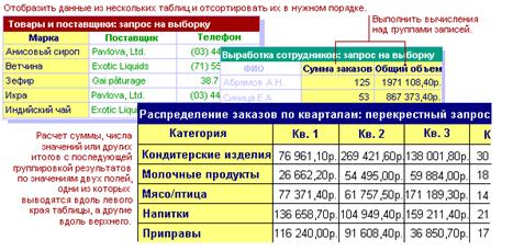 Рис. 16. 8. Типы запросов, создаваемых в Microsoft Access: Ø Запросы на выборку и их использование Запрос на выборку является наиболее часто используемым типом запроса. Запросы этого типа возвращают данные из одной или нескольких таблиц и отображают их в виде таблицы, записи в которой можно обновлять (с некоторыми ограничениями). Запросы на выборку можно также использовать для группировки записей и вычисления сумм, средних значений, подсчета записей и нахождения других типов итоговых значений. Ø Запросы с параметрами и их использование Запрос с параметрами — это запрос, при выполнении отображающий в собственном диалоговом окне приглашение ввести данные, например, условие для возвращения записей или значение, которое требуется вставить в поле. Можно разработать запрос, выводящий приглашение на ввод нескольких единиц данных, например, двух дат. Затем Microsoft Access может вернуть все записи, приходящиеся на интервал времени между этими датами. Запросы с параметрами также удобно использовать в качестве основы для форм, отчетов и страниц доступа к данным. Например, на основе запроса с параметрами можно создать месячный отчет о доходах. При печати данного отчета Microsoft Access выводит на экран приглашение ввести месяц, доходы за который должны быть приведены в отчете. После ввода месяца Microsoft Access выполняет печать соответствующего отчета. Для ввода параметров запроса можно создать специальную форму или диалоговое окно, вместо использования диалогового окна запроса с параметрами. Ø Перекрестные запросы и их использование В перекрестном запросе отображаются результаты статистических расчетов (суммы, количество записей и средние значения), выполненных по данным из одного поля таблицы. Эти результаты группируются по двум наборам данных, один из которых расположен в левом столбце таблицы, а второй — в верхней строке. Совет. Данные перекрестной таблицы можно вывести и без создания отдельного запроса в базе данных — либо с помощью мастера сводных таблиц в форме, либо создав сводный список на странице доступа к данным. При использовании сводной формы или сводного списка можно изменять заголовки строк и столбцов по мере необходимости, чтобы анализировать данные с разных сторон. Ø Запросы на изменение и их использование Запросом на изменение называют запрос, который за одну операцию вносит изменения в несколько записей. Существует четыре типа запросов на изменение: на удаление, на обновление и добавление записей, а также на создание таблицы. Date: 2015-05-23; view: 580; Нарушение авторских прав |