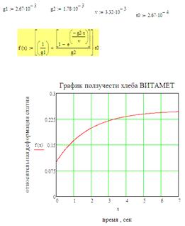 Рис. 2.. Экспериментальная кривая ползучести хлеба «ВИТАМЕТ» Полученная модель дает количественное основание для регулирования технологией и рецептурой (в основном – водой) свойств хлеба, наиболее полно удовлетворяющих требования потребителей и отслеживания процесса старения хлеба при хранении в части реологических свойств. В хлебе «ВИТАМЕТ» в управлении реологическими свойствами необходимо было уменьшать или полностью исключить влияние вязкой составляющей в компоненте Максвелла, поскольку именно она ответственна за остаточную пластическую компоненту деформации, величину которой сенсорно оценивает потребитель. Математически описание идеальных структурно-механических свойств хлеба «ВИТАМЕТ» выглядит следующим образом:
