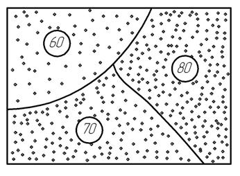 Графическое изображение важнейших признаков, характерных для обширных территориальных объектов, имеет большое значение. Это могут быть населенные пункты, сельскохозяйственные организации, фермерские, крестьянские хозяйства, административные районы, области, государства и т.д. Например, возникла необходимость наглядно показать интенсивность размещения посевов льна-долгунца, сахарной свеклы, рапса и других технических культур по территории области. В таких случаях статистика рекомендует воспользоваться одним из популярных способов графического изображения – картограммами. Картограмма – контурная географическая карта, на которой штриховкой различной густоты, точками или окраской различной степени насыщенности показана сравнительная интенсивность какого-либо показателя в пределах каждой единицы нанесенного на карту территориального деления. В зависимости от того, каким способом изображена интенсивность того или другого показателя, различают точечные и фоновые картограммы. Точечная картограмма – разновидность картограммы, на которой уровень интенсивности признака графически показан с помощью точек, размещенных на контурной карте какой-либо территориальной единицы. Для усиления наглядности изображения на контурной карте плотности или частоты появления определенного признака точкой обозначают одну единицу совокупности или некоторое их количество (рис. 5.13).