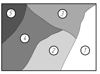 Рис. 5.14. Плотность радиоактивного загрязнения территории садово-дачных товариществ (Ku/км2): 1 – до 1,0; 2 – 1,01-2,0; 3 – 2,01-3,0; 4 – 3,01-4,0; 5 – 4,01 и более