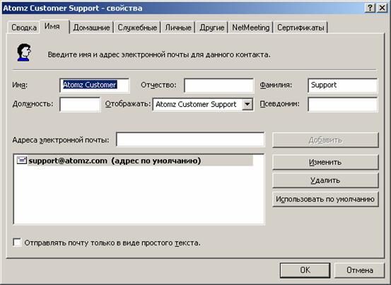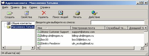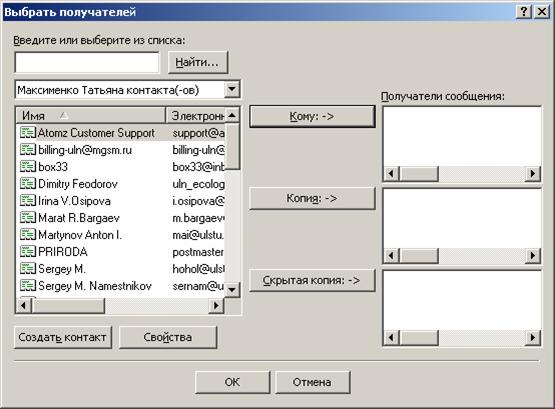 Создать нового адресата - создание новой записи в данной группе адресной книги. Создать новую группу - открытие новой тематической папки для адресатов определённой группы. Удалить - избавление от записи или группы записей. Поиск - встроенная поисковая система для поиска конкретных людей на бескрайних просторах сети Интернет. Для создания нового адресата необходимо выполнить следующие действия: Выберите команду Адресная книга меню Сервис. Появится окно Адресная книга. Нажмите кнопку Создать Контакт на панели инструментов окна Адресная книга. На экране появится диалог Свойства. Вкладки Личные, Служебные, Заметки предназначены для задания дополнительной информации о текущем корреспонденте. В полях ввода Имя, Фамилия, Отчество наберите соответственно фамилию, имя и отчество адресата. Щелкните мышью на поле Адреса электронной почты и наберите на клавиатуре адрес его электронной почты. Нажмите кнопку Добавить, чтобы занести адрес в книгу. Нажмите кнопку ОК, чтобы закрыть диалог Свойства. Когда в вашей адресной книгебудет большое количество записей, вы сможете найти нужного человека по фамилии, набирая ее в поле ввода, которое находится ниже панели инструментов в окне Адресная книга. Для закрытия адресной книги, выберите команду Закрыть меню Файл или щелкните мышью на кнопке