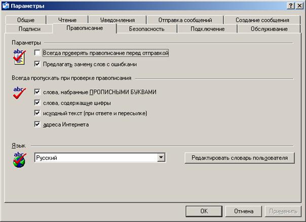 На этом заполнение конверта отправляемого письма завершено. В текстовом окне пишите текст письма. Инструментальная панель для форматирования текста похожа на инструментальную в Microsoft Word. После того, как текст письма набран, вы можете проверить орфографию, используя для этого команду Правописание меню Сервис или клавишу F7. Для смены языка, используемого при проверке орфографии, выполните команду Параметры в меню Сервис. На вкладке Правописание выберите Язык, на котором написано письмо. Здесь же вы можете настроить параметры проверки правописания.