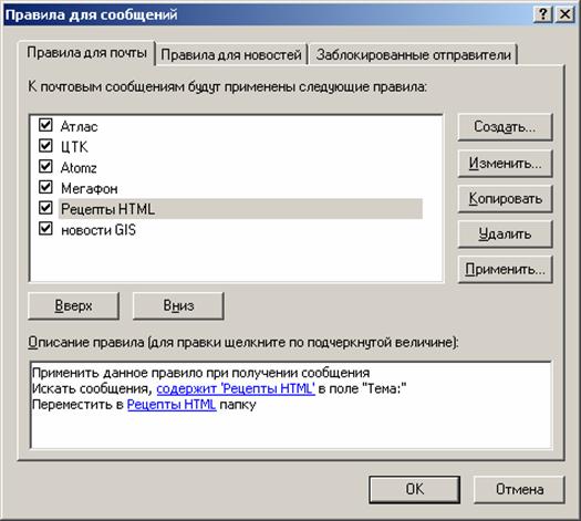 Для создания, редактирования или удаления правил обработки писем необходимо вызвать окно Правила для сообщений и перейти на вкладку Правила для почты. Вызов окна осуществляется командой Правила для сообщений/Почта… из меню Сервис. С помощью кнопок Создать, Изменить, Копировать, Удалить, Применить окна Правила для сообщений можно соответственно создать новое правило, модифицировать уже существующее правило, скопировать правило, удалить правило, применить правило к ранее полученным сообщениям. При создании нового правила обработки электронных писем на экране появляется окно Создать правило для почты, которое состоит из четырех полей. В первом поле Выберите условия для данного правила перечислены признаки, по которым может осуществляться идентификация сообщения: искать сообщения, содержащие адресатов в поле "От"; искать сообщения, содержащие заданные слова в поле "Тема"; искать сообщения, содержащие заданные слова; искать сообщения, содержащие адресатов в поле "Кому"; искать сообщения, содержащие адресатов в поле "Копия"; искать сообщения, содержащие адресатов в полях "Кому" и "Копия"; искать сообщения с пометкой важности; искать сообщения, полученные с определенной учетной записи; искать сообщения, размер которых превышает заданный размер; искать сообщения с вложением; искать безопасные сообщения; все сообщения. Во втором поле Выберите действия для данного правила перечислены действия, которые должны быть выполнены над письмами, удовлетворяющими указанным признакам. В программе Outlook Express определены следующие действия: переместить в заданную папку; скопировать в заданную папку; удалить; переслать адресатам; выделить цветом; пометить; пометить как прочитанное; пометить сообщение как просмотренное или пропущенное; ответить заданным сообщением; прекращение выполнения дополнительных правил; не загружать с сервера; удалить с сервера. В третьем поле Описание правила приведено описание правила, для редактирования параметров которого необходимо щелкнуть по названию конкретного параметра, а в четвертом поле указывается название создаваемого правила. В четвертом поле вы пишите название правила. Пример 1: Для того чтобы происходило автоматическое удаление всех сообщений полученных с почтового сервера fio.ifmo.ru, необходимо выполнить следующие действия: в окне Создать правило для почты, в поле Выберите условия для данного правила установите флажок напротив записи Искать сообщения, содержащие адресатов в поле От; в поле Выберите действия для данного правила установите флажок напротив записи Удалить; в поле Описание правила щелкните мышкой по словосочетанию содержащие адресатов и в появившемся окне Выбор получателей введите имя сервера fio.ifmo.ru и щелкните по кнопке Добавить, а затем по кнопке ОК. Пример 2: Для того, чтобы происходило автоматическое перемещение в папку Привет всех писем, содержащих в качестве темы сообщения слово "привет" необходимо выполнить следующие действия: создайте папку Привет; в окне Создать правило для почты, в поле Выберите условия для данного правила установите флажок напротив записи Искать сообщения, содержащие заданные слова в поле "Тема"; в поле Выберите действия для данного правила поставьте галочку на запись Переместить в заданную папку;