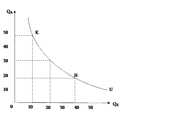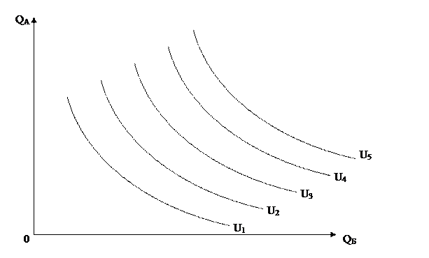 Кривая безразличия показывает различные комбинации (наборы) двух благ (А и Б), дающие потребителю равный объем удовлетворения или равную общую полезность. Кривая безразличия имеет отрицательный наклон. Обусловлено это тем, что потребитель, чтобы сохранить ту же общую полезность товарного набора, уменьшение количества одного блага компенсирует увеличением количества другого блага. А так как предельные полезности этих благ не всегда равны в силу действия закона убывающей предельной полезности, то и пропорция замещения одной единицей данного блага какого-то количества другого блага изменяется. Поэтому кривая безразличия имеет не просто отрицательный наклон, она еще и выпукла к началу координат. Причем ее наклон по отношению к началу координат изменяется: он уменьшается по мере продвижения от набора К к набору Н. Наклон кривой безразличия в данном случае отражает величину предельной нормы замещения, которая показывает количество единиц одного блага, от которого потребитель готов отказаться в пользу одной единицы другого блага, сохранив при этом тот же уровень общей полезности. Кривая безразличия соответствует некой величине общей полезности или удовлетворения потребителя. Увеличение же количества одного из благ при неизменном количестве другого приведет к увеличению общей полезности данного набора, и этот набор будут соответствовать уже другой кривой безразличия. Это дает основание изобразить целую серию таких кривых безразличия или карту кривых безразличия, каждая из которых соответствует различной величине общей полезности. Причем каждая следующая кривая, дальше отстоящая от начала координат, соответствует большей величине общей полезности.