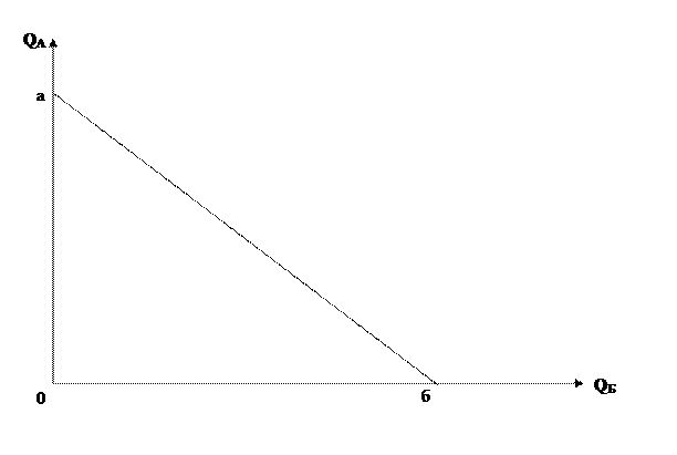 Кривые безразличия имеют следующие особенности: 1. Кривые безразличия имеют отрицательный наклон, так как выражают обратную зависимость между количеством благ А и Б. Поэтому, чтобы увеличить количество одного блага в потреблении при сохранении той же величины общей полезности нужно пожертвовать каким-то количеством другого блага. 2. Кривые безразличия никогда не пересекаются, т.к. они отражают разную величину общей полезности. 3. Кривые безразличия выпуклы к началу координат, и наклон этих кривых по отношению к началу координат отражает величину предельной нормы замещения. Кривые безразличия описывают потребительские предпочтения. Но на потребительский выбор человека наряду с его предпочтениями влияют его доход и цены на товары, т.е. его покупательные возможности. Для анализа покупательных возможностей потребителей используют бюджетные линии. Бюджетная линия показывает различные наборы (комбинации) двух благ, которые потребитель может приобрести при фиксированной величине его денежного дохода и данном уровне цен приобретаемых благ. Предположим, что доход потребителя составляет 12 ден. ед., а цены продуктов А и Б соответственно 3 и 2 ден. ед. Если весь доход будет направлен на покупку продукта А, то его хватит на приобретение 4 ед. продукта (точка а), а если покупать только продукт Б, то его можно будет купить только 6 ед. (точка б). Соединив точки а и б, мы получим бюджетную линию: