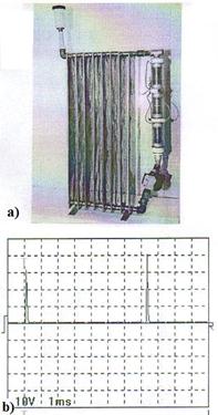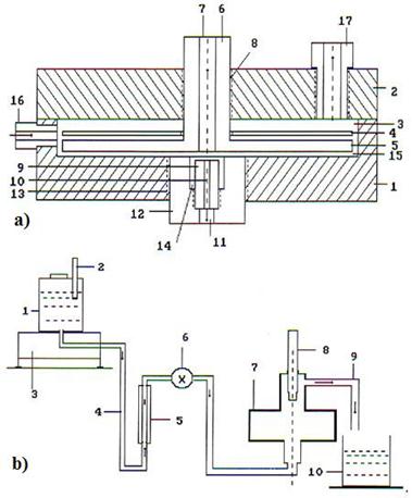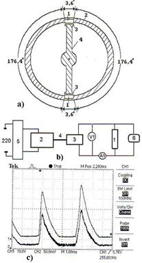 Рис. 2: а) схема ячейки водоэлектрического генератора тепла (патент № 2258098): 9 – катод; 4 – анод; 15 – диэлектрический зазор; b) cхема экспериментальной установки