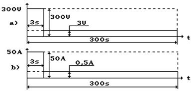 Рис. 3. Схема времени действия максимальных (300 В, 50 А) и средних (3,0 В, 0,5 А) значений напряжения и тока