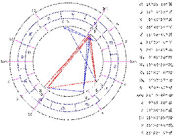 Рис. 28 Первое, что бросается в глаза - активный третий дом, имеющий связи со всеми домами гороскопа, почти как у писателя. Кроме того, активный первый дом, т.е. первый дом также имеет связи с элементами почти всех других домов. Это означает, что менеджеру требуется много личной (и даже физической) энергии для его деятельности. Хороший менеджер это без преувеличения "лицо" организации (а лицо - это первый дом). Формула высшего образования не обязательна, т.е. связи типа III+IX могут отсутствовать. Таким образом, формула III+IV+IX+X полностью может быть не представлена. Менеджер ведь не научный работник, не всегда девятый дом бывает в связке. IX+X тоже не обязательно для менеджера. Вопрос: Можно ли III+IV+IX+X рассматривать вообще как формулу высшего образования? Ответ: В общем, да. А дальше мы конкретизируем, в какой сфере деятельности это высшее образование. Но вы не забывайте, что высшее образование есть не только в интеллектуальных профессиях, II+IV+IX+X - тоже высшее образование, но в искусстве (музыкант, скульптор, художник и т.п.). В моей практике были случаи, когда у ребенка в карте не было вышеназванных указаний. При разговоре с родителями выяснялось, что ребенок не хочет учиться, в ВУЗ поступать не собирается, а оба родителя имеют высшее образование и предпринимают титанические усилия запихнуть его хоть в какой-то ВУЗ. Скажу сразу: бесполезно! Не мучайте ребенка и себя, он все равно этот ВУЗ бросит, не доучившись. Зачем же зря терять нервы и время? А у парня была формула I+IX+XII. Путешественник. Я им так и сказал: пусть идет в мореходное, получает среднее специальное и плавает в дальние страны. Юноша принял это предложение с энтузиазмом, сейчас ходит механиком на сухогрузе в Африку и Южную Америку. Доволен и счастлив. На этом примере лишний раз убедился, что родители, в плане профориентации, часто враги своим детям. Вернемся к менеджерам. Я заметил, что у менеджеров есть аспекты Меркурия с Марсом и/или Плутоном. В нашем примере Меркурий в соединении с Марсом и в оппозиции с Плутоном (есть много общего с журналистами и полиглотами - она свободно говорит на английском). Очень много энергии ума, и вообще, человек активный, подвижный, я бы даже сказал, суперактивный и суперподвижный. А говорит - как из пулемета стреляет, убеждает сразу и наповал, возразить невозможно, придется заключить контракт и купить все, что он тебе захочет "втюхать". Третий дом находится под влиянием (Сатурна | X дома) и (Солнца | V дома). Это роднит их с математиками, но математик - это организованный ум. Поэтому менеджер - это организатор. Влияние Сатурна (или элементов Х дома) на третий дом концентрирует внимание и дает настойчивость в решении проблем. В нашем примере Солнце управляет III домом и Солнце в аспекте с Плутоном в III доме - раз и два. Меркурий (соуправитель III) в соединении с Марсом (управитель V), в трине с Нептуном (соуправитель V) и в квадратуре с Луной (стоит в V) - три, четыре, пять. Плутон (стоит в III) в аспектах с Нептуном, Луной и Марсом (все - элементы V дома) - шесть, семь, восемь. Плутон ретрограден, следовательно, также связан со Скорпионом и управляет V домом. Плутон стоит в III, в соединении с Ураном (элемент III дома) и в оппозиции с Меркурием (соуправитель III дома) - девять, десять, одиннадцать. Итого, одиннадцать связей третьего дома с Солнцем и/или пятым домом. Сатурн в этом примере не имеет связей с э